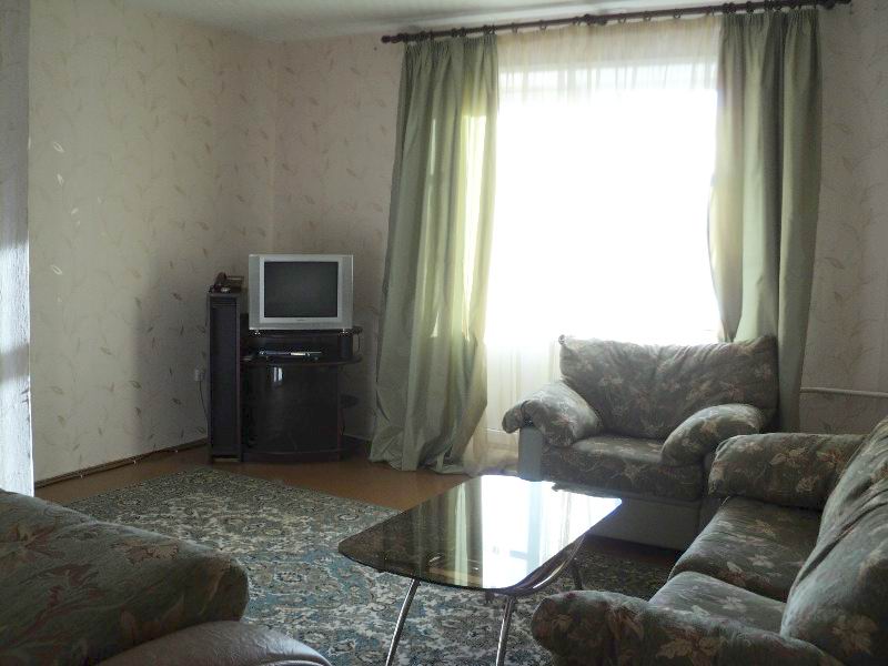 В комнате имеется все необходимое для комфортного проживания: мягкая мебель (2 дивана, кресло), на полу - ковер, стеклянный столик, телевизор, DVD плейер.
